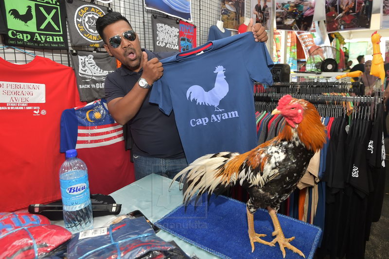 | Shahid menunjukkan pakaian Cap Ayam keluarannya yang laris di serata negeri. Foto oleh Harish Fadzillah Abu Kassim |