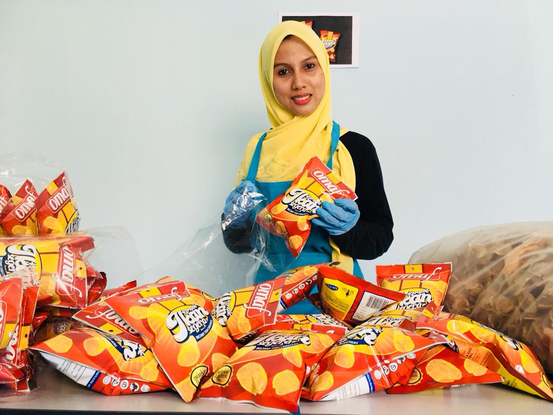 | Nor Hasnaa Kamilah bersama produk keropok ikan berjenama OMAF keluaran syarikat miliknya Sempurna A-Nad Marketing, |