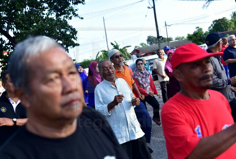 | Ahmad Razif bersama warga emas melakukan senaman taichi pada Program Kesejahteraan Warga Emas DUN Seberang Takir, di Dataran Telaga Daing, Seberang Takir. Foto oleh Tengku Syamim Tengku Ismail |