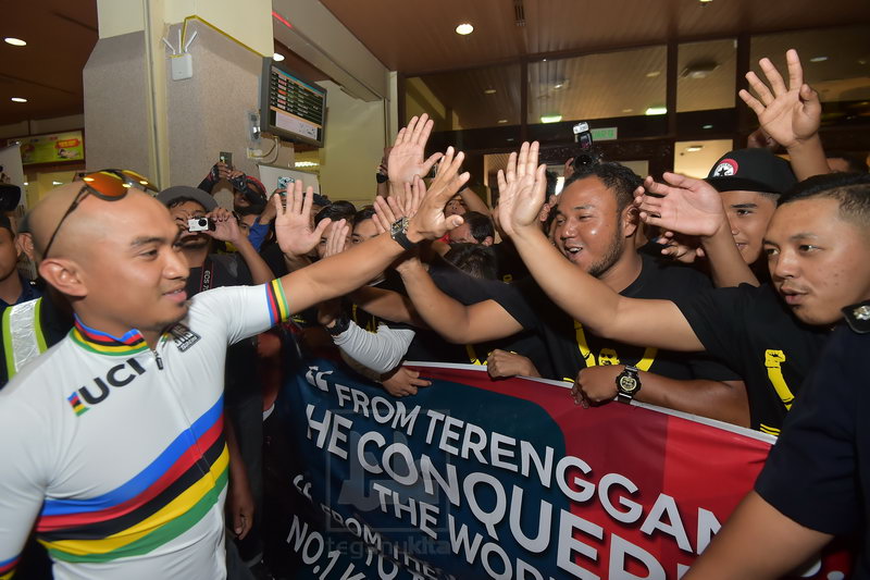 | Azizulhasni disambut bagai wira sebaik tiba di Lapangan Terbang Sultan Mahmud (LTSM), Kuala Nerus, pagi ini. Foto Harish Fadzillah Kassim |